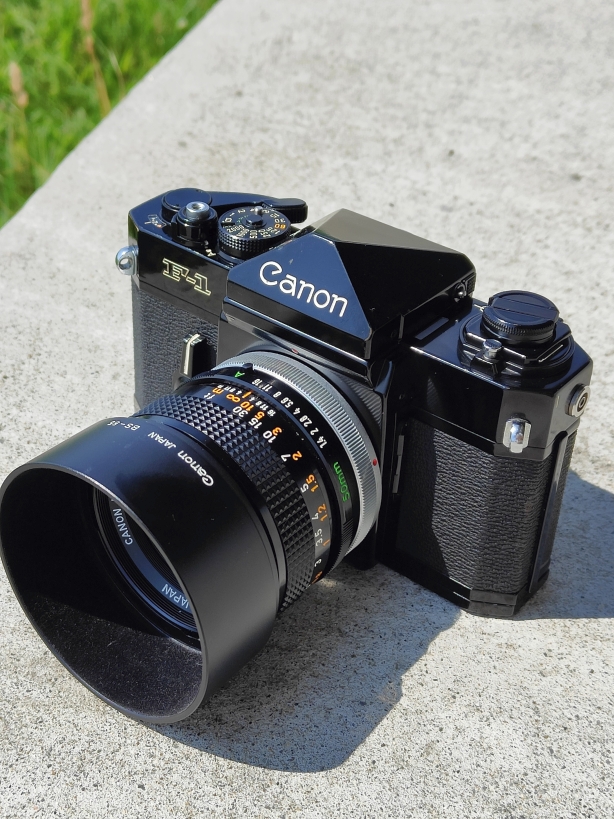 やっぱりさ、金属のボディのカメラって格好いいよね。このF-1には特にそういう印象というか雰囲気を感じるような気がする。自分が思うに、ボディが大きくて、Canonが自信をもって送り出してて、機械式カメラの最終形っていう背景があるからかな、F-1には王者っていう言葉がぴったり合う気がするんだよね。