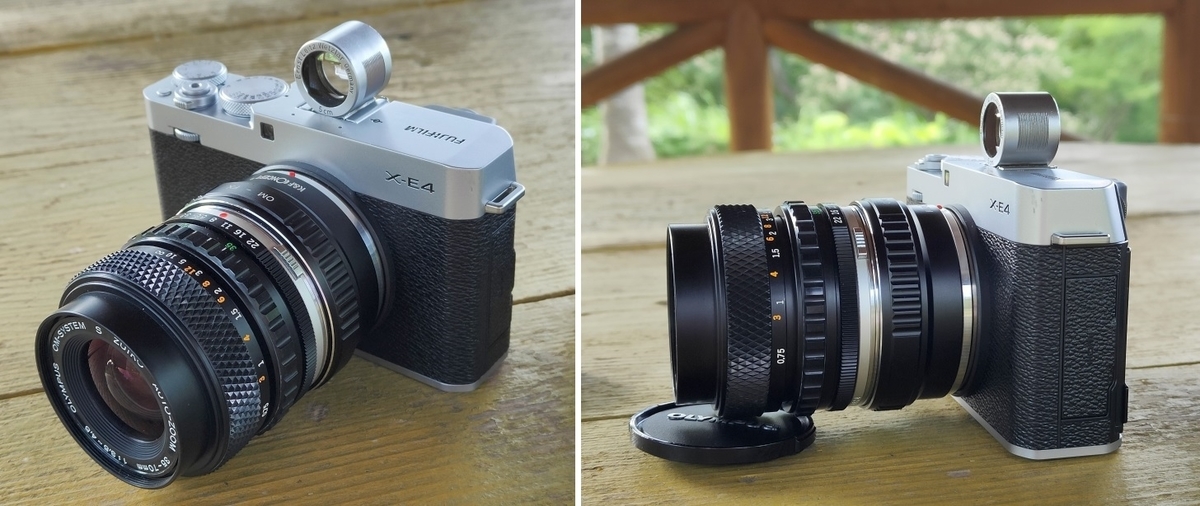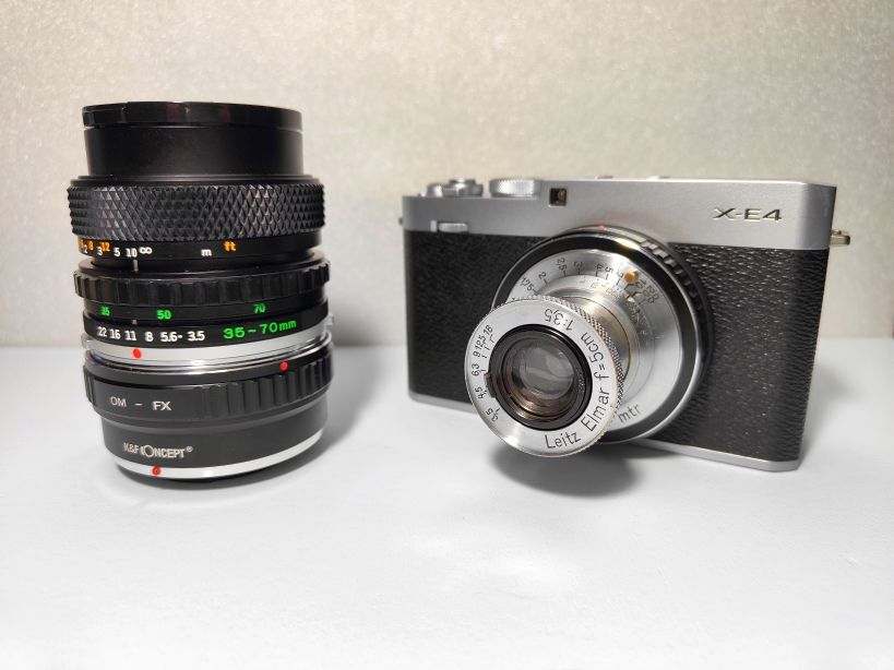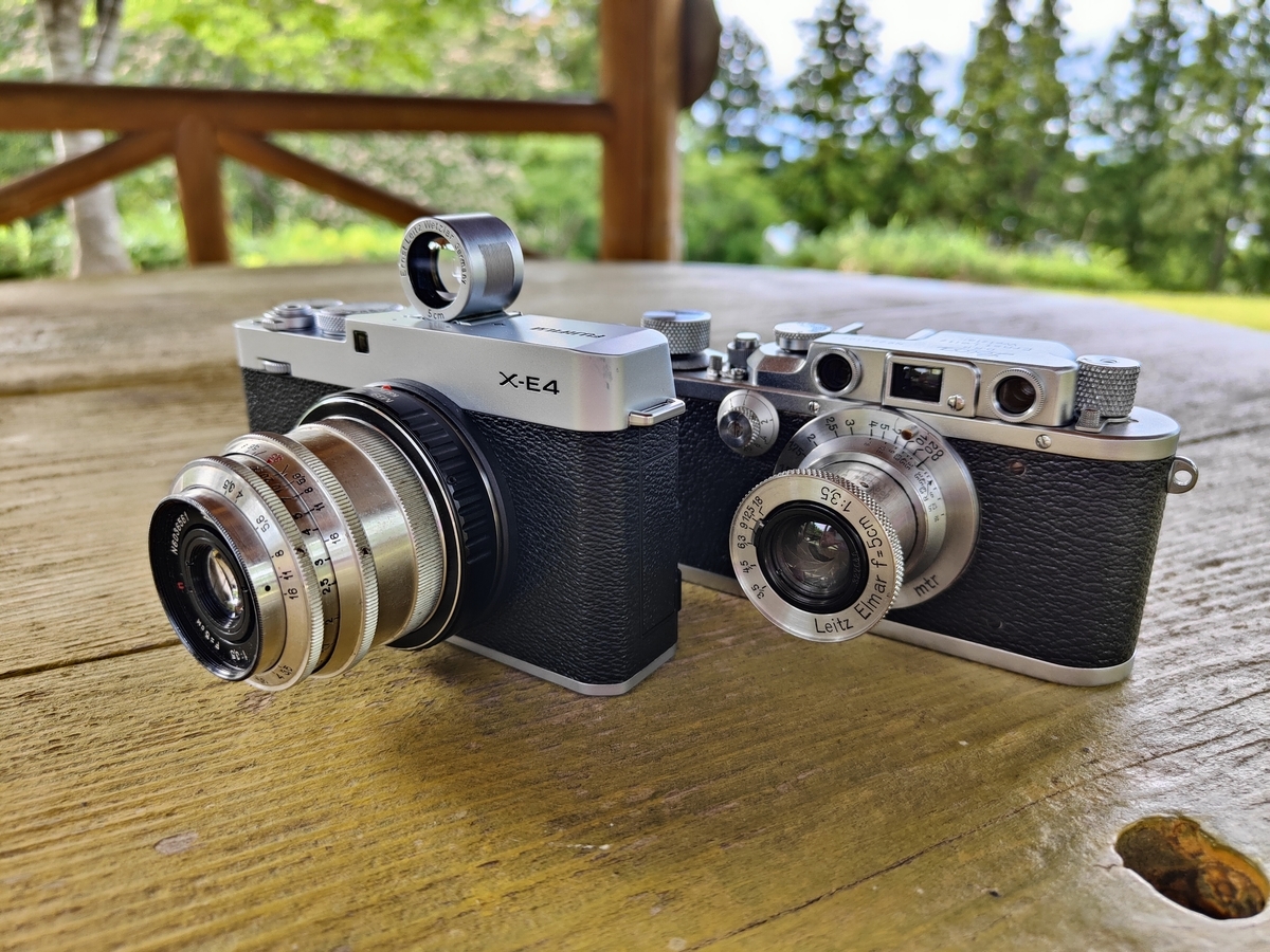 SBOOIとElmarを付けるとLeica感でてない?まぁでてないよね。SBOOIはお飾り。X-E4にElmar 5cmの組み合わせなら換算75mm相当になっちゃうし。マウントアダプター (K&F conceptのM39-FX) も、仕方ないとはいえちょっと異物感というか不格好になっちゃって美しくないしね。