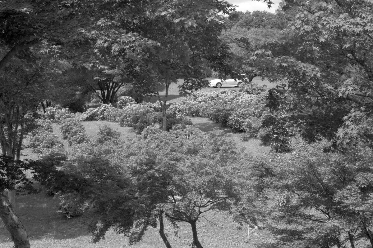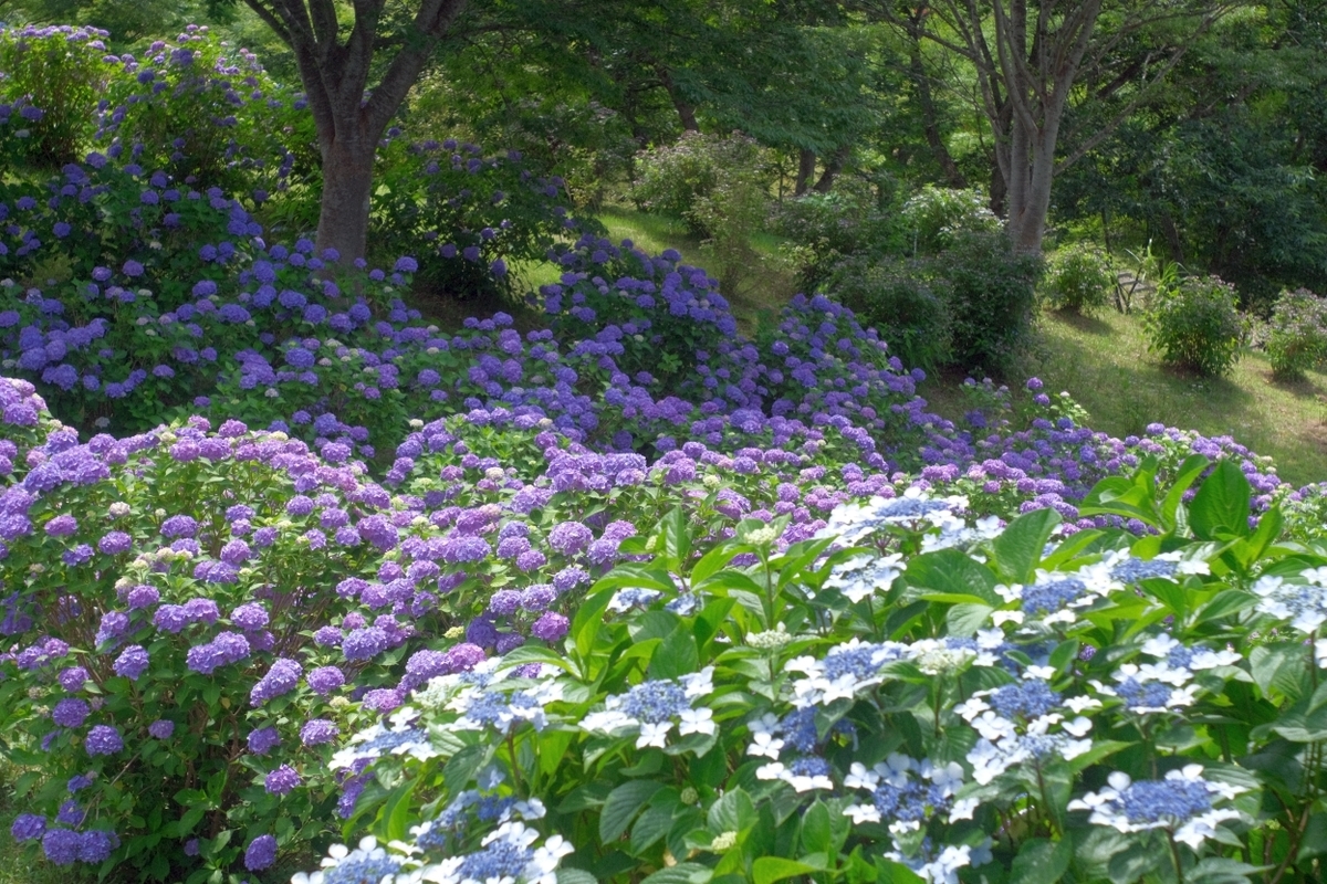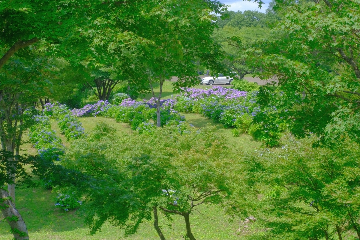 入口から少し進むと案内板があって、案内板に向かって右に進むと広い駐車場がある。左に行くと紫陽花が植えられている所の近くに行ける。駐車場の他、園内の道路の途中にも数台止めれる駐車スペースがある。道はつながってるからどっち行っても問題なし。