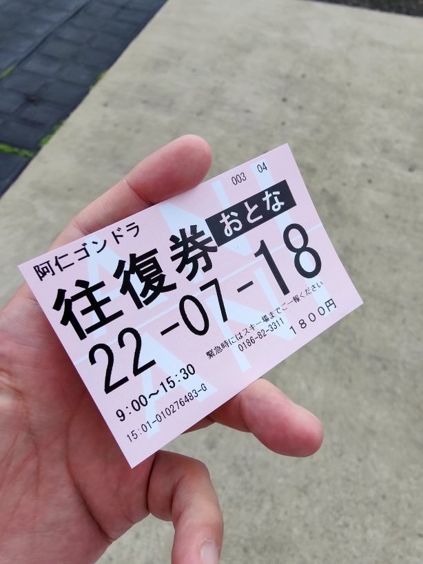 往復券は1,800円で、所要時間は片道20分くらい。ゴンドラの運行時間は夏の時期で上りが15:30、下りは16:00が最終らしい。随時運行しているから好きな時間に乗り場に行けばOK。